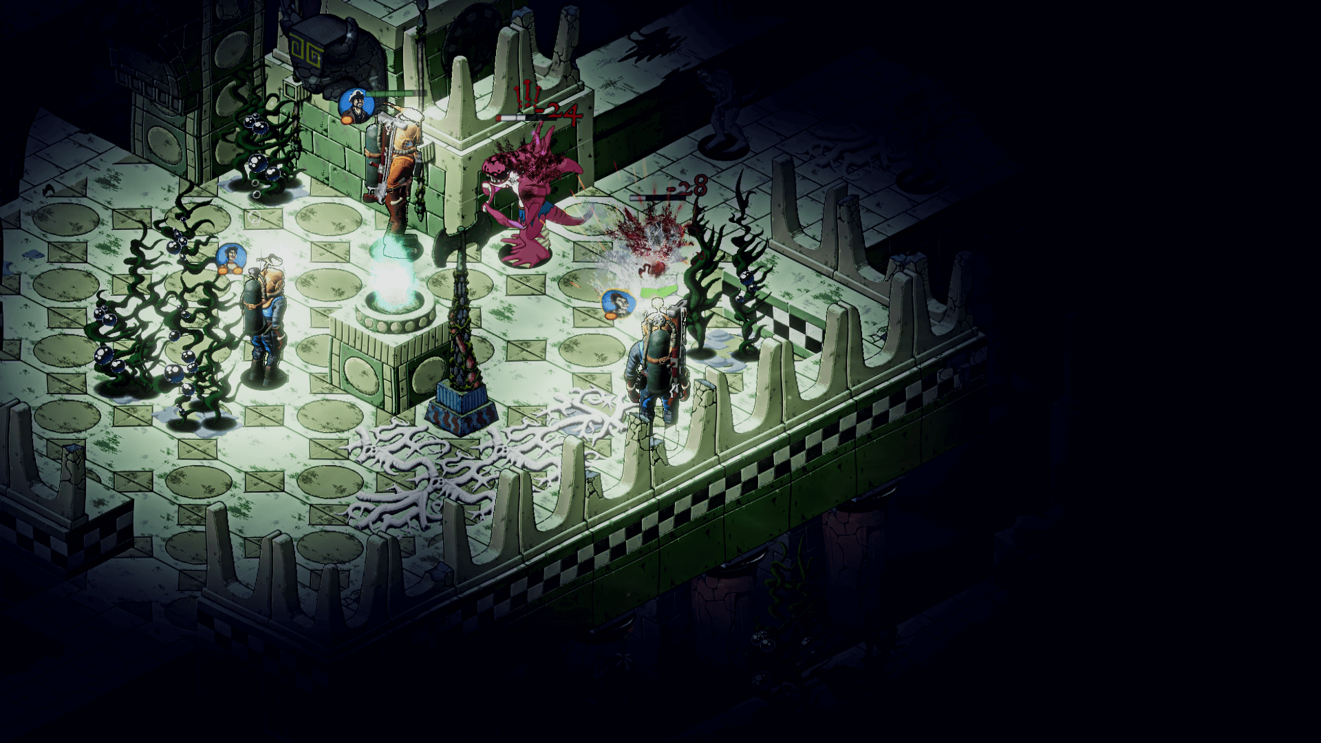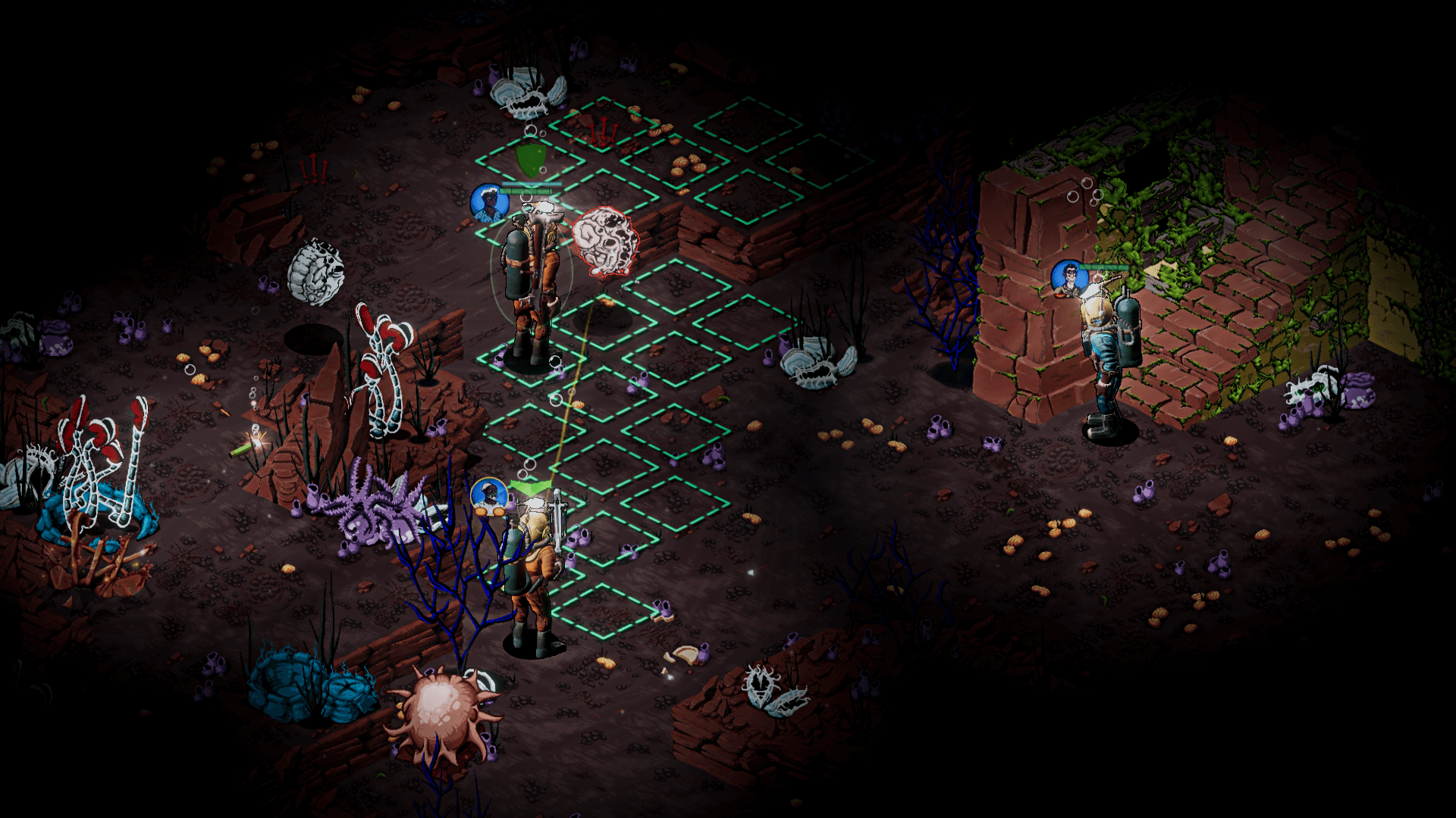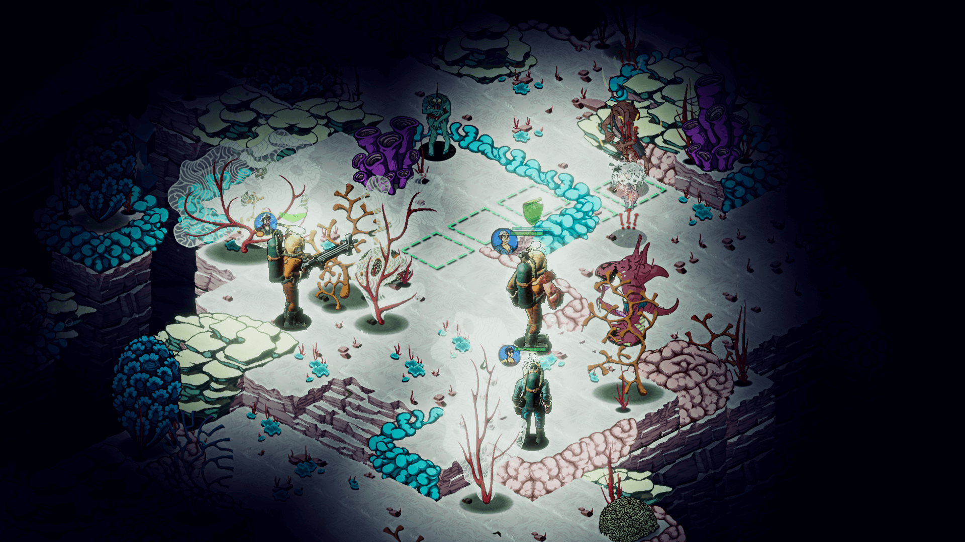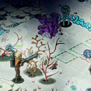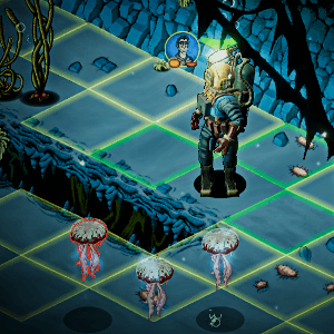 The hauntingly beautiful environment holds many secrets and mysteries to explore, but danger lurks just outside the feeble circles of light our heroes bring with them. Your strategic skills are challenged constantly: managing scant resources, keeping the crew breathing and sane, and leading them in combat against the twisted and mutated denizens of the abyss.